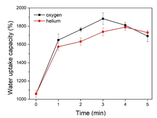 The influence of the plasma treatment parameters on the water uptake capacity of the textile pile debridement material is shown in Figure 8. It can be observed that the water uptake capacity of the samples after the plasma treatments is apparently higher than that of the control sample without treatment, verifying the positive impacts of plasma treatment on the water uptake capacity of the textile pile debridement material. In addition, oxygen plasma has a more sensitive effect than helium plasma, which could be attributed to the introduction of oxygen-containing polar groups and the enhancement of the surface energy of the polyester fiber [29]. Meanwhile, the water uptake capacity of the samples treated by oxygen and helium plasma first rose and then fell with the extension of the treatment time, and peak values were achieved at 3 min for oxygen and 4 min for helium plasma. Therefore, the optimum parameters of plasma treatment are oxygen atmosphere, at a power of 150 W, for 3 min. All the subsequent measurements, including mechanical properties, coagulation activity, and the in vitro biofilm removal test, are performed on samples after plasma treatment with the above optimum parameters.