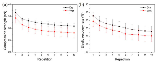 Percentage of wet/dry compression strength and elastic recovery rate under different compression repetitions.