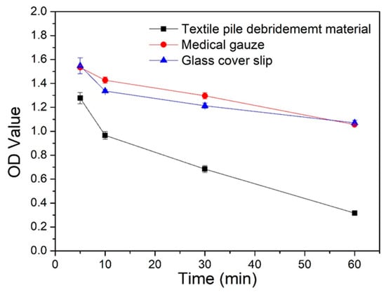 The absorbance OD value at 540 nm of aqueous blood solutions at different time points is displayed in Figure 10. The lower the absorbance value, the less the content of free hemoglobin in the blood aqueous solution, signifying a better blood clotting efficiency. The absorbance values of textile pile debridement material at all time points were significantly lower than that of medical gauze and glass cover slips, which implies that the textile pile debridement material has a faster coagulation rate compared to gauze and glass cover slips. The OD value of the debridement material at 5 min is similar to the value of the glass cover slip at 30 min. In other words, the blood clotting effect of the glass cover slip at 30 min will be achieved by the textile pile debridement material within 5 min, suggesting that the textile pile debridement material has a higher ability to promote blood coagulation compared to the glass cover slip, which is always considered as a material with a high coagulation performance [30]. This may have resulted from the distinct three-dimensional structure of debridement materials. Pile fibers in contact with blood are densely and vertically arranged, forming irregular channels, which increase the contact space between the blood and fibers. Meanwhile, the structure of gauze is two-dimensional. In addition, the gaps among the fibers are relatively large and independent, which is not beneficial for blood clotting.