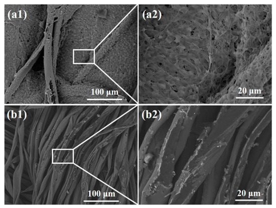 SEM images of the textile pile debridement material and gauze at 30 min in the blood coagulation test are shown in Figure 11. A dense fibrin net containing a large number of blood cells was observed among the fibers of the textile pile debridement material. Meanwhile, fibers attached to scarce red blood cells among the threads of the gauze. The SEM results confirm that the blood clotting reaction was completed on the textile pile debridement material. The fibrinogen in the plasma was transformed into a fibrin monomer, which formed stable long-chain fibrin polymers. The interlacing of the fibrin polymers constituted a complex cross-linking network, which macroscopically appeared as clots.