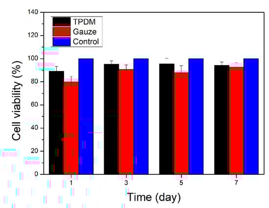 The relative cell viability was employed to evaluate the in vitro cytotoxicity results of the textile pile debridement material. Cell viability was expressed as the percentage of the OD value of the experimental group to the control group. Figure 12 shows the in vitro cytotoxicity results of the textile pile debridement material and medical gauze. It can be seen that the cell viability of the textile pile debridement material at different times are all above 85% and are higher than for medical gauze, indicating that the textile pile debridement material has no obvious cytotoxic effect. However, in the future, a direct cultivation of the cells onto the textile pile debridement material’s surface is necessary to evaluate the pile material’s scratching effect on cells and to avoid any damage to the healing tissue.