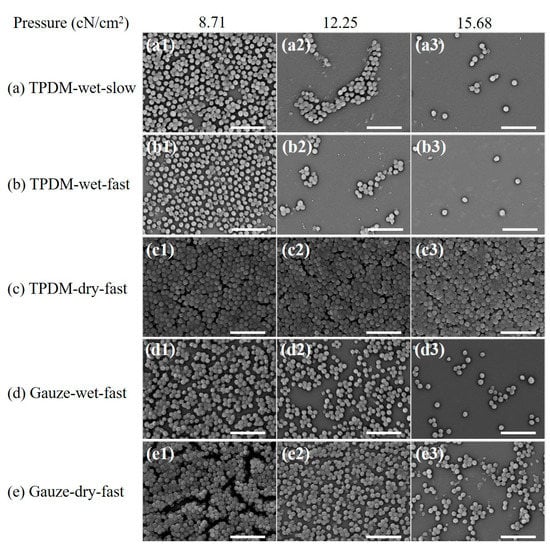 The SEM morphology results of biofilms under different in vitro debridement conditions (Figure 15) are consistent with the MTT results. Compared with Figure 14, the bacterial densities of all the SEM images in Figure 15 show a decrease to a certain extent, which manifests that physical debridement is an effective method to remove biofilms. It can be clearly seen that the number of bacterial colonies in Figure 15 goes down in various levels with the increase in pressure, except for Figure 15c. This demonstrates that pressure is positive for the removal of biofilms. Compare the results between dry and wet conditions. The bacterial population in dry debridement (Figure 15c,e) is obviously larger than that in wet conditions (Figure 15a,b,d), especially for the textile pile debridement material (Figure 15c). Meanwhile, for medical gauze, although there are still stacked bacterial colonies, noticeable cracks and separations can be observed under a pressure of 8.71 cN/cm2 (Figure 15e1). Moreover, with the increase in applied pressure, a single layer of spherical bacteria is found and the bacterial distribution density gradually decreases in Figure 15e2,e3. This may be caused by diversity in the structure and thickness of the textile pile debridement material and medical gauze. The textile pile debridement material designed in this study is a kind of three-dimensional pile fabric with a high thickness (about 10 mm), while medical gauze is eight layers of woven fabric in a plain structure with a much lower thickness (approximately 3 mm). In addition, the pile fibers in the textile debridement material are vertical in direction, i.e., parallel to the compression action, leading to an absorption and cushioning effect, as well as a poor pressure force delivery from top to bottom. Therefore, the effect of the textile pile debridement material during dry debridement is inferior to that of medical gauze, and the amount of bacterial colonies does not change significantly under different pressures. For the SEM results under wet conditions, the number of residue bacterial colonies in Figure 15b is obviously less than that in Figure 15d, indicating that the textile pile debridement material has a much better biofilm removal effect than medical gauze. Further exploring the impact of wiping speed, it can be seen that the residual bacteria population after fast debridement (Figure 15b) is noticeably lower and more scattered than those debrided at a slow speed (Figure 15a). Thus, a high debridement speed is recommended for the practice of biofilm removal.