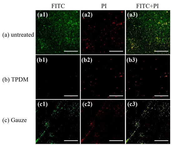 FITC is a green nucleic acid probe with the ability to make polysaccharide in an extracellular matrix green. PI is a red fluorescent dye which can only stain DNA in bacteria. It can be clearly observed from Figure 16a that the field of vision is full of S. aureus stained in green, suggesting the typical characteristic of glycocalyx formation in the biofilm. In contrast, green bacteria are barely observed in Figure 16b, indicating a satisfactory removal of biofilm through the action of textile pile debridement material. For biofilms treated with medical gauze, scratches are obviously found and the green area is much smaller than that of the control biofilm, which indicates that the debridement effect of medical gauze is not as good as that of the textile pile debridement material. All the CLSM results are consistent with the results acquired by MTT and SEM.