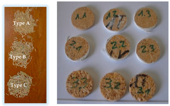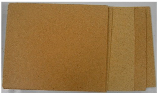 To make the agglomerated particleboards, the mat was formed in a mould of dimensions 400 mm × 600 mm and was subjected to a pressure of 2.6 MPa and a temperature of 120 °C for 4 min in a hot plate press. The formed boards were left to cool outdoors in a vertical position for 24 h. The production characteristics of the three types of panels are shown in Table 2 and several of the panels are shown in Figure 1. Eight boards of each type were manufactured. The particleboards consisted of a single layer and their approximate dimensions were 600 mm × 400 mm × 7.5 mm.