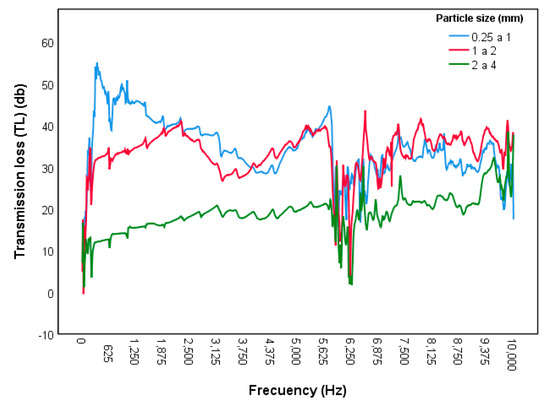 A larger amount of acoustic energy is lost in boards with a smaller particle size, with the sound energy being lower than the incident energy up to 52 dB at a frequency of 400 Hz. The mean sound transmission loss for boards with particle sizes of 0.25 to 1 mm is 37.5 dB, for particle sizes 1 to 2 mm it is 31.5 dB and for particle sizes 2 to 4 mm it is 15 dB. The sound transmission loss depends on the density of the board and on the particle size. This shows that reed boards can be a good acoustic insulating material, as the sound is attenuated more with smaller particle sizes and the sound absorption coefficient is greater with larger particles.