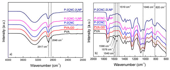 The intermolecular interactions between neat PVA and crosslinker in presence of CNC and LNP in nanocomposite films were studied by FT-IR spectroscopy, related spectra are reported in Figure 2. The neat PVA spectrum exhibits characteristic peak at 1645 cm−1, associated with stretching and deformation vibration of OH groups, potentially sensitive to intermolecular interactions []. Peaks at 1329, 1086 and 1043 cm−1 can be associated with the deformation vibration of C–O groups []. It is expected that crosslinking of PVA by GD decreases the number of hydroxyl groups by forming crosslink ester bonds in the PVA, with variations in intensity for −OH and −C = O (ester) group []. Disappearance of peaks at 1576 and 1540 cm−1, due to deformation of CH bonds, can be an indication of possible crosslinking reaction.