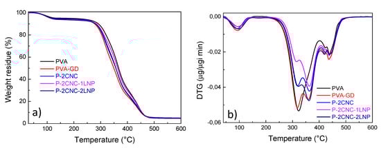 TG (a) and DTG curves (b) of PVA, PVA-GD, P-2CNC, P-2CNC-1LNP and P-2CNC-2LNP films.