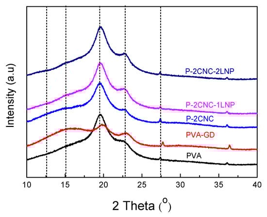 The results of WAXD analysis of neat PVA and PVA nanocomposites films are reported in Figure 4. The two main diffraction peaks at 2θ = 19.8° and 22.8° for pure PVA are associated with the (101) and (200) orthorhombic lattice structure planes, respectively. Meanwhile, the peak at 2θ = 19.8° was responsible of presences for strong inter- and intra-molecular H bonding [,]. It is noted that the diffraction peaks of PVA-GD declined, suggesting that the well-organized PVA chain in the crystalline section could be destructed, due to the presence of GD. However, the characteristic diffraction peaks of PVA also appear in the diffraction patterns of all the PVA nanocomposites, suggesting that the crystal structure of PVA was essentially recovered with the introduction of CNC and LNP. In the case of P-2CNC, in correspondence of main diffraction peaks for CNC (2θ = 14.8°, 16.6° and 22.9°), the PVA signal showed a different shape. When lignin, having a three-dimensional amorphous structure [], was added to the film, no variation was found in the spectrum. In the cases of CNC/LNP-containing systems, the diffraction peak at 2θ = 19.8° did not change significantly, while the peak intensity at 2θ = 22.8° slightly and gradually increased in comparison with pure PVA, indicating that the crystalline region was enhanced. Evaluation of crystallinity degree values from partial areas confirms that crosslinking reduced the crystallinity (from 39.9% for neat PVA to 25.4% for PVA-GD), while the introduction of CNC and LNP partially recovered it (mean value of 30.9% for P-2CNC, 30.5% for P-2CNC-1LNP and 31.2% for P-2CNC-2LNP).