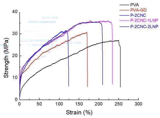 Stress–strain curves of PVA and PVA nanocomposite films.