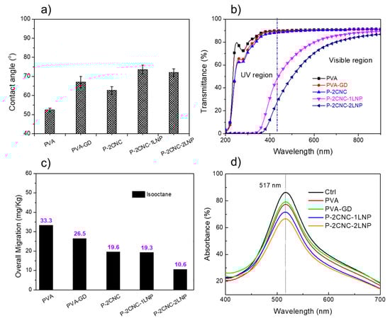 (a) Water contact angle of different PVA composite films; (b) UV transmittance of PVA nanocomposite films; (c) Overall migration values of different PVA nanocomposite films in isooctane solution and (d) Antioxidant property of migrated ingredients from different PVA nanocomposite films.