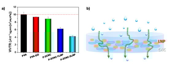The WVTR value of neat PVA was 1.1 × 10−13 kg m/m2 s Pa, while the PVA-GD decreased to 0.94 × 10−13 kg m/m2 s Pa, suggesting intramolecular crosslinking between PVA molecular chains. Clearly, as CNC were added, the WVTR decreased to 0.89 × 10−13 kg m/m2 s Pa. Furthermore, the WVTR could be reduced to 0.42 × 10−13 kg m/m2 s Pa when another 2 wt.% of LNP was loaded. This could be interpreted as being on the basis of the modified WVTR pathway. In composite films, the nanofillers serve as impermeable physical barriers in the PLA matrix, and then form a tortuous pathway and force water vapour to swing around them to pass through a more tortuous route, resulting in the improvement of gas barrier performance []. On the other hand, the well-dispersed CNC and LNP and excellent synergistic interactions between the nanofillers and PVA in the presence of glutaraldehyde better acted in modifying significantly the tortuous paths, as schematically illustrated in Figure 8b. Consequently, the diffusion paths of water molecules throughout PVA composite films reduced.