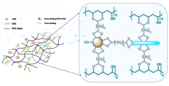 PVA intermolecular cross-linking reaction between PVA chain and CNC, LNP via glutaraldehyde.