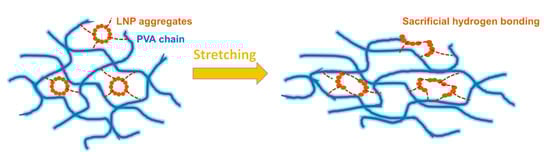 Schematic sacrificial hydrogen bond reinforcing mechanism of LNP in PVA film.
