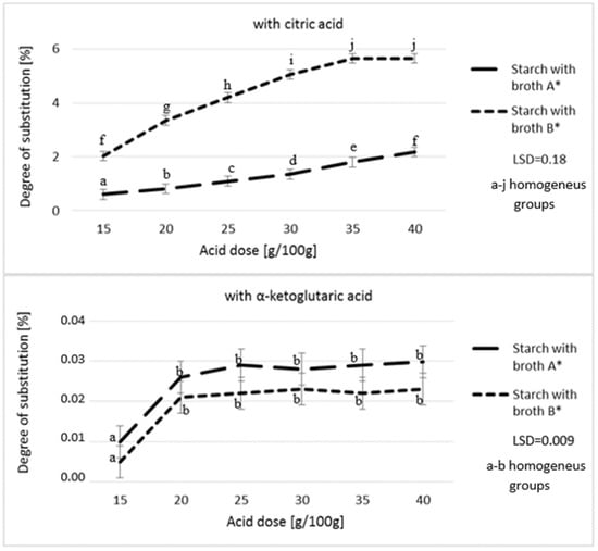 Effect of acid dose on the degree of starch substitution. * Broth A—α-ketoglutaric acid 60 g/L; citric acid 18 g/L; pyruvic acid 1 g/L; Broth B—α-ketoglutaric acid 49 g/L; citric acid 46 g/L; pyruvic acid 1.5 g/L.