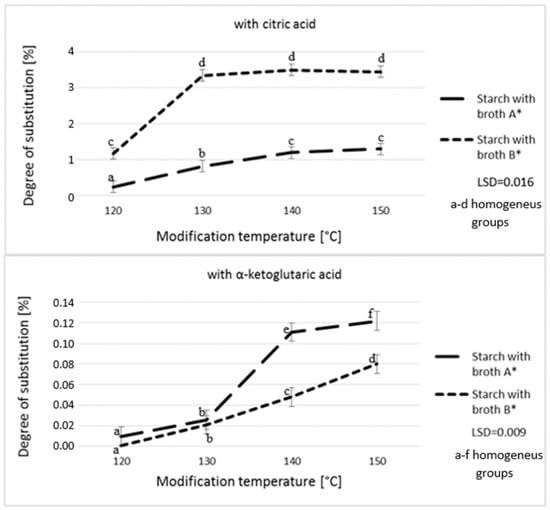 Effect of modification temperature on the degree of starch substitution. * Broth A—α-ketoglutaric acid 60 g/L; citric acid 18 g/L; pyruvic acid 1 g/L; Broth B—α-ketoglutaric acid 49 g/L; citric acid 46 g/L; pyruvic acid 1.5 g/L.