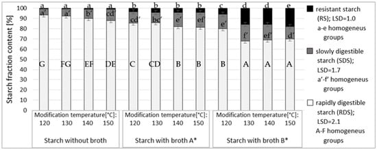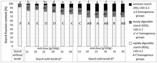 Figure 3 shows the content of resistant starch in the modified starch preparations as affected by the dose and type of broth. To determine effects of the esterifying factors analyzed in the study, starch roasted without acids was used as a blank sample.