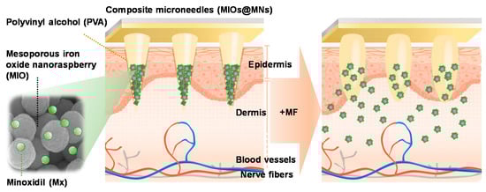 Schematic mechanism of microneedle patch system applying on the surface of skin. Polyvinyl alcohol (PVA) was used to prepare microneedles (MNs) with dissolvable properties. A mesoporous iron oxide nanoraspberry (MIO) encapsulating Minoxdil (Mx) inside the MNs were triggered by external magnetic field (MF), leading to local temperature increases as well as controlled release.