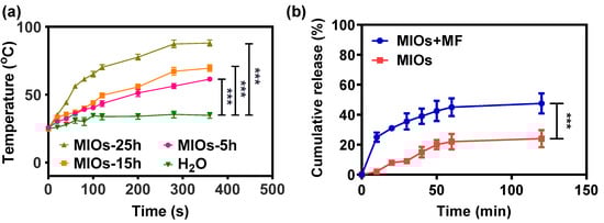 Controllable properties of MIOs. (a) temperature changes of MIOs solution under MF at a power of 3.2 kW and a frequency of 1 MHz. (b) cumulative release profile of Mx from MIOs with and without external MF treatment. Data points represent mean ± SD (N = 3, *** p < 0.005).