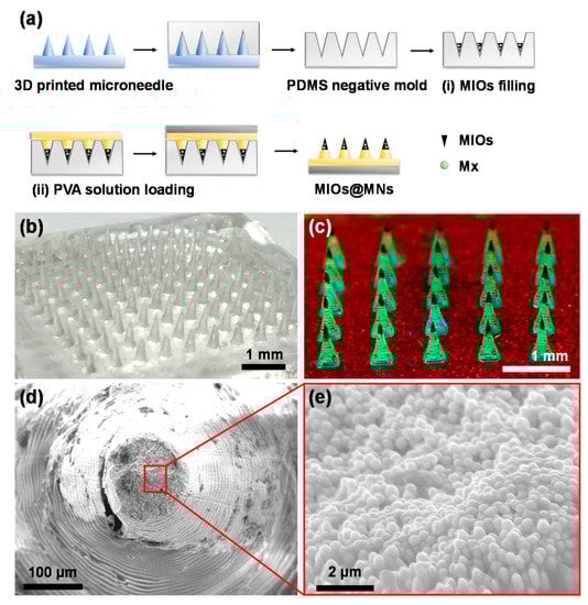 (a) Synthesis process of composite MNs with digital light processing (DLP) 3D printing and polydimethylsiloxane (PDMS) molding. Two steps of filling were carried out: (i) MIOs and (ii) PVA filling. The images of (b) PVA MNs and (c) composite MNs after mold preparation. MNs with MIOs (at needle tips) and green fluorescence PVA. SEM image of composite MNs in (d) low and (e) high magnification.