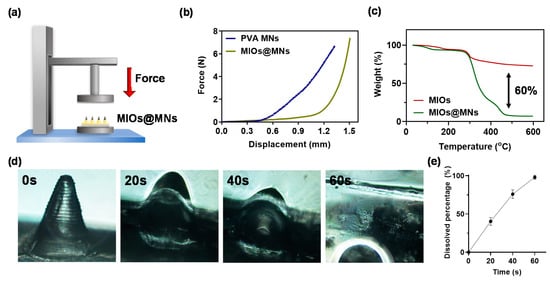 Have demonstrated the structures of composite MNs, the mechanical property of composite MNs was estimated to confirm the ability to break through the stratum corneum barrier. The setup of the experiment was illustrated in Figure 6a, and the pressure versus displacement map obtained by applying pressure under the CT3 Texture (Figure 6b). The composite MNs were able to break the stratum corneum, where the minimum pressure required to break the stratum corneum was 0.17 N/needle [41]. Both PVA and composite MNs had sufficient mechanical strength to break the stratum. Furthermore, the thermogravimetric analyzer (TGA) was used to determine the weight ratio of MIOs and PVA in a single needle (Figure 6c). The result revealed the MIOs contributed 10% weight ratio in composite MNs, and 60% weight ratio of composite MNs was offered from organic materials such as PVA.
