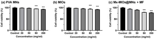 The cell viability of HIG-82 cells incubated with (a) PVA MNs, (b) MIOs, and (c) Mx-MIOs MNs+MF. Data points represent mean ± SD (N = 5, *** p < 0.005).
