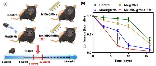 In vivo evaluation of dissolvable MNs for hair loss treatment. (a) schematic illustration represents control, Mx@MNs, Mx-MIOs@MNs, and Mx-MIOs@MNs+MF groups for hair loss treatment for 16 days. (b) the hair intensity treated by control, Mx@MNs, Mx-MIOs@MNs, and Mx-MIOs@MNs+MF groups for hair growth on mice. Data points represent mean ± SD (N = 3, *** p < 0.005).