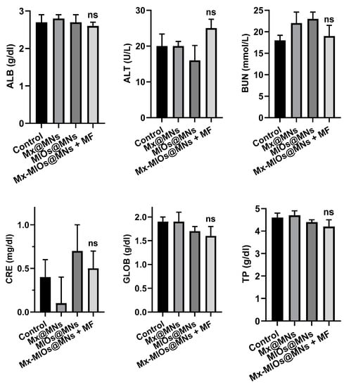 The toxicity of liver and kidney. Kidney functions of albumin (ALB), alanine aminotransferase (ALT), blood urea nitrogen (BUN), creatinine (CRE), globulin (GLOB), and total protein (TP) of mice treated by Mx@MNs, Mx-MIOs@MNs, and Mx-MIOs@MNs+MF (n = 3, mean ± SD, ns: No significant difference).