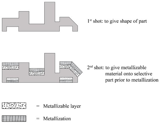 Two-shot injection molding consists of two separate molding cycles. It generally uses different type of plastic that are plate-able (with plating catalyst) and non-plate able (without platting catalyst). The major advantage of two-shot injection molding is related to geometric design freedom which enable to create a very complex three-dimensional circuitry. Also, this is highly suitable for high-volume production with uniform precision. In this process, the first shot of non-plate able plastic is injected into a mold cavity to form the main component. Afterwards, the cavity in the first shot is filled by the second shot of plate able plastic on its locally surface where circuit tracks is required prior to metallization of the conductive structures [46,47,48,49,50]. The schematic of two-shot injection molding is showed in Figure 2.