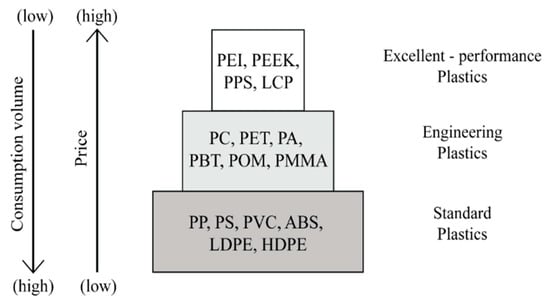 There are many different polymers used to manufacture the MID substrate. The choice of material and production process are primarily linked to mechanical, thermal and electrical requirement of the purpose of MID application. Thermoplastics materials are the most used to fabricate the MID substrate [63,64,65]. They can be subdivided on the basis of heat distortion resistance, long-term service temperature and the price of raw material. The plastics pyramid depicted in Figure 3 describe the three major subgroups of thermoplastic materials [66,67]. In the plastics pyramid, the presence of high-performance plastics is very scarce, but extremely interesting in terms of engineering applications. However, high-performance plastics are associated to high prices and costly processing which may entail limitations for industrial use. On the other hand, many MIDs are made of engineering-grade thermoplastics, because they are available at low cost and present virtually no difficulties for manufacturing in the existing production facilities. Typically, the characterization of an MID substrate materials depends primarily on the material properties which are responsible for indicating how the material behaves during metallization along with the chemical resistance. The pyramid overview is considered a guideline to select materials for MID [68,69].