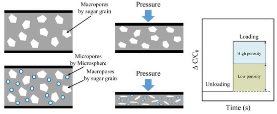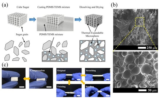 To detect higher pressure ranges with high sensitivity, commercially available polymeric three-dimensional (3-D) porous structures are employed as a dielectric layer in capacitive type sensors. The polymeric porous structures can easily deform even at low pressures, owing to reduced stiffness and the anti-barreling phenomenon []. During the unloading state, due to the low viscoelastic property, a porous structure reverses to its original state without any physical defect. These features make sensors that are based on porous structures useful for monitoring human motion. Various methods of fabricating polymer-based porous structures such as 3-D printing [,], gas foaming [], phase separation [,], and the templating process [,,,] have been introduced over the last 10 years. Of these, the templating process offers ease of fabrication, broad applicability, eco-friendliness, and uniformity of the templating process using selectively soluble sugar and salt in water. Research has shown that these pressure sensors have high sensitivity and wide pressure ranges [,,]. Han et al. showed that the carbon nanotube (CNT)-polydimethylsiloxane (PDMS) sponge could be applied to pressure sensors via conductive pathway change to withstand compressive stress []. Iglio et al. also suggested PDMS sponges decorated with CNT for detecting subtle pressure (20 Pa) to a larger working range (50 kPa) []. Kwon et al. reported a pressure sensor based on the giant piezocapacitive effect of a porous dielectric elastomer having a softer elastomer and lower elasticity than PDMS, and capable of wide pressure detection range (~130 kPa) []. These studies focused on enhancing performance by using conductive nanomaterials on the sponge or changing the polymer materials while maintaining the porosity. While the above methods can improve the performance of the sensors, it cannot step up or tune the sensor sensitivity. The easiest and fastest way to tune the sensor sensitivity in stages is to adjust its porosity. As the porosity increases, relative permittivity (piezocapacitive effect) changes along with the mechanical properties, making it possible to improve sensor sensitivity step by step as desired.