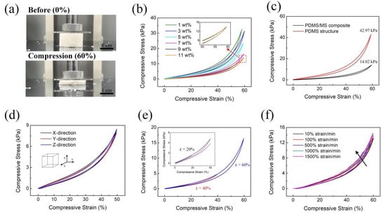 Mechanical evaluation of the PDMS/MS composite. (a) The compressive schematic of PDMS/MS composite at 60% strain. (b) The measured compressive stress–strain curves according to the concentration of PDMS/MS composite. The curves of 9 and 11 wt.% almost overlap; hence, the 9 wt.% concentration is selected as the maximization point. (c) Comparison of compression characteristics of bare PDMS structure and PDMS/MS composite at 60% strain. (d) The evaluated compressive stress–strain curves with change in compression direction (x, y, z-direction) for investigating the uniformity of MS. (e) The stress–strain curves of PDMS/MS composite with different set strains. (f) Stress–strain curves tested under different strain rates.