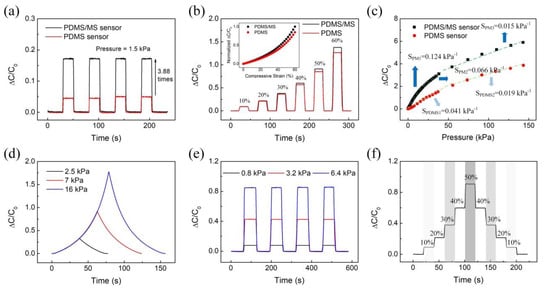 Figure 3a shows images of the fabricated PDMS/MS composite when it is compressed at 60% strain to evaluate its mechanical properties. The mechanical properties of the PDMS/MS composite are different because of the change in porosity resulting from the concentration of the MS. We quantitatively measured the compressive stress–strain of the PDMS/MS composite at 60% strain at different MS concentrations (Figure 3b). As the MS concentration increased, compressive stress decreased until it reached 9 wt.%. As the MS concentration increased from 9 wt.% to 11 wt.%, the maximum compressive stress decreased by 0.4%. The results indicate that the 9 wt.% concentration of the MS is the fabrication limit via the capillary effect because of the high viscosity. The 9 wt.% of PDMS/MS composite was therefore used in the measurements of mechanical properties and capacitive pressure sensors. To compare the PDMS/MS composite and bare PDMS structure, as shown in Figure 3c, the compressive stress–strain of the porous structure was measured with up to 60% compression with 10% strain min−1. In cases of the PDMS structure, a pressure of about 42.97 kPa was required for 60% strain, while the PDMS/MS composite required pressure of only 14.07 kPa for the same strain. The results represent that the addition of MS into the porous structure reduces the stiffness and makes the structure easily compressible with pressure. As MS has low specific gravity, it can contribute to aggregation and non-uniform arrangement on the porous structure. For investigating the uniformity of the porous structure, we evaluated mechanical properties with compression direction in the x, y, z-directions (Figure 3d). We verified that the error of compressive stress–strain in each direction was within 1%, which means that the PDMS/MS composite exhibits isotropic sensing performance and can be used in any direction. Furthermore, we measured the compression stress at 20%, 40%, and 60% strain, as shown in Figure 3e. The compressive stress rapidly increased with an increase in strain. At maximum strain, the area between the loading and unloading curves (hysteresis) was bigger. Usually, when pressure is applied to a polymer, the polymer absorbs the potential energy and uses it to recover to its original state []. The area between the loading and unloading curves represents the energy loss in the compression process, which is why hysteresis occurs. In our experiments, the loading and unloading curves almost overlapped, thereby ensuring minimal hysteresis in the sensors. Finally, we assessed the compressive stress–strain when the PDMS/MS composite was compressed at different strain rates (10~1500% strain min−1) for loading and unloading (Figure 3f). High compressive stress of up to 500% strain min−1 is required to deform the porous structure at a faster compression rate. The measurement results exhibited negligible differences and high stability characteristics over the entire strain rate, making it useful for applications that require detecting various frequencies without additional calibration.