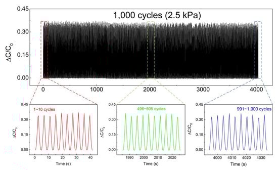 Reliability test results of the pressure sensor over 1000 cycles with measurement capacitance values. The red, green, and blue graphs show measurement results of the initial, middle, and final 10 cycles, respectively.
