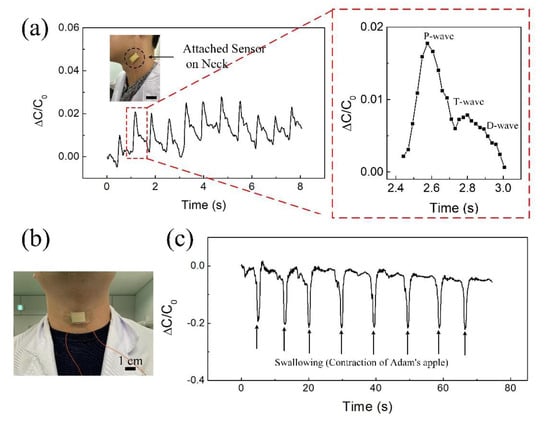 Because of their excellent sensitivity, durability, fast response time, and wide detection range, the fabricated flexible pressure sensors with a PDMS/MS composite could be applied to health monitoring and wearable devices. First, we evaluated the capabilities of these sensors in health monitoring (small deformation). The pressure sensors were tightly attached to the surface of the skin, such as the human neck, through adhesive bandages. As shown in Figure 7a, our sensors could accurately monitor the blood pressure of a human carotid in real time. The neck pulses could be read out clearly under normal conditions (60~66 beats per minute) with regular wave shapes. Under these conditions, a typical carotid pulse waveform with three clear peaks was obtained: the Percussion wave (P-wave), Tidal wave (T-wave), and Diastolic wave (D-wave), which are related to the systolic and diastolic blood pressure, the late systolic augmentation, and the heart rate, respectively []. Additionally, we measured motion near the throat when a test subject swallowed their saliva. This motion released the compressed sponge, thus increasing relative capacitance values. Figure 7b shows the sensor with a PDMS/MS composite attached to the Adam’s apple. These measured capacitance values enable us to detect and distinguish the various motions near the throat and can be used to monitor human physiological activities (Figure 7c).
