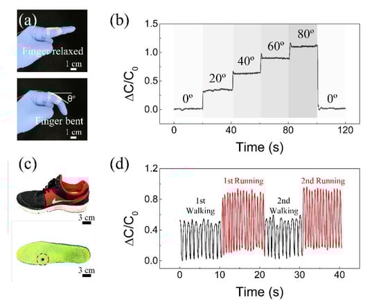 To demonstrate the applicability of our sensor for detecting high pressures, we applied the sensor to a wearable application where the bending angle of the index finger was evaluated. The flexible sensor was placed onto the index finger using a commercial bandage, and its angle was gradually changed as shown in Figure 8a. The angle variations were divided into five stages, starting at a relaxed stage of 0° and then bent at angles of 20°, 40°, 60°, 80°, and 0° respectively. Figure 8b shows the measurement results of the relative capacitance values according to the index finger’s angle. The corresponding relative capacitance values increased significantly with the finger bending angle. Finally, we fabricated a shoe insole with integrated, flexible pressure sensors, and capacitance values from different motions such as running and walking were measured for 10 s in alternation. Figure 8c shows photos of the shoe and shoe insole with attached sensor. It can be observed that the sensor shows different relative capacitance values to different motions (Figure 8d). These results confirm the sensor based on the PDMS/MS composite can accurately sense and distinguish a different scale of pressure.