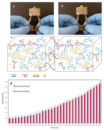 - Shao, C.; Wang, M.; Meng, L.; Chang, H.; Wang, B.; Xu, F.; Yang, J.; Wan, P. Mussel-inspired cellulose nanocomposite tough hydrogels with synergistic self-healing, adhesive, and strain-sensitive properties. Chem. Mater. 2018, 30, 3110–3121. [Google Scholar] [CrossRef]