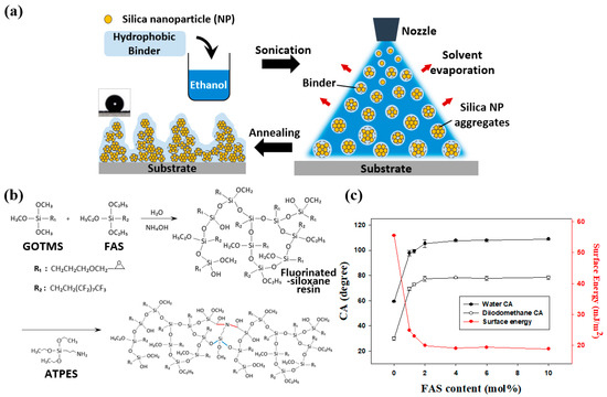 (Heptadecafluoro-1,1,2,2-tetrahydrodecyl)triethoxysilane (FAS) was obtained from Gelest (Morrisville, PA, USA). (3-Glycidyloxypropyl)trimethoxysilane (GOTMS), (3-aminopropyl)triethoxysilane (APTES), an ammonium hydroxide solution, and 15–30 nm (ø) fumed silica NPs were purchased from Sigma-Aldrich (St. Louis, MO, USA). Absolute ethanol was purchased from Duksan Inc. (Ansan, South Korea).