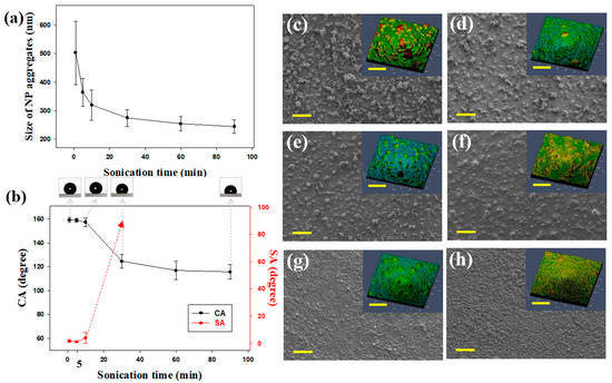 A solid surface’s wettability of generally depends on its chemical composition and surface morphology. The CA of any flat surface cannot surpass 120° even if its surface energy is low [34,35]. Thus, surface roughness is essential for a non-wetting surface. A surface can be easily roughened by spray coating it with a colloidal silica solution. Several spray-coating variables govern the hydrophobicity of coatings. It was determined that the aggregation of silica NPs in the coating solution considerably affects the wetting behavior of a spray-coated surface. As expected, the size of NP aggregates in our solutions depended on the sonication time. The aggregates decreased in size with an increase in the sonication time (Figure 2a and Figure S3, Supplementary Materials). When the sonication time increased from 1 to 90 min, the average size of the silica NP aggregates decreased from ~500 to ~240 nm.