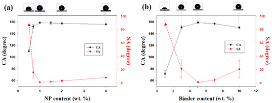 CAs and SAs of spray-coated samples with (a) NP contents of 0.5, 0.7, 1.0, 1.5, 2.0, and 4.0 wt. % with 5 wt. % of binder, and (b) binder contents of 1, 3, 5, 7, and 10 wt. % with 1 wt. % of NP content.
