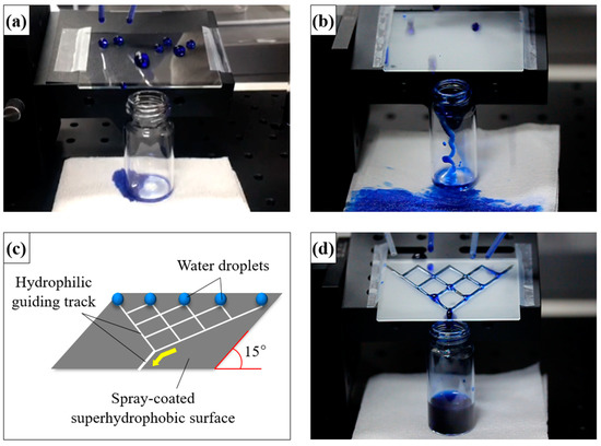 Transportation and collection of water droplets dyed with methylene blue on coated surfaces tilted at 15°. (a) Hydrophobic surface with no silica NPs; (b) superhydrophobic surface with NPs; (c) schematic of a superhydrophobic surface with hydrophilic patterns; and (d) patterned superhydrophobic surface.