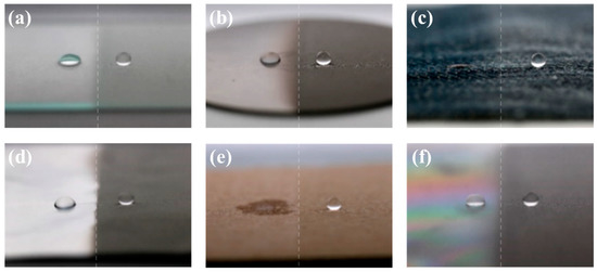 Photographs of water droplets on (a) glass, (b) metal, (c) fabric, (d) aluminum foil, (e) paper, (e) uncoated plastic surface, and (f) coated plastic surface.