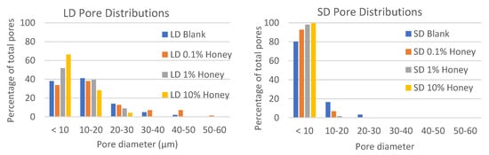 Honey reduces pore size. Histograms of pore distributions in LD and SD templates with 0%, 0.1%, 1%, and 10% honey.