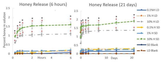 Honey release is higher for SD templates than LD templates. Percent honey v/v in PBS incubated with each template type for 21 days. * indicates a significant difference between the LD and SD templates of the corresponding honey concentration, and + indicates a significant difference from all other honey concentrations and non-honey blank of the corresponding fiber diameter (SD or LD). Note: the 1% honey LD samples are significantly different from the LD blank from day 3 onward, the 1% honey SD samples are significantly different from SD blank for days 14 and 21, and the 0.1% honey SD samples are significantly different from SD blank from day 3 onward. Due to clustering of these lines on the graphs, these differences were unable to be notated. Sample size = 4. Raw data is available in Supplementary Spreadsheet 2.