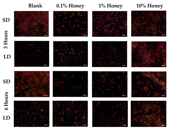 The reduction in NETosis is not caused by honey-driven necrosis. The percentage of cell nuclei identified as NETosing or necrotic are shown for LD and SD templates at 3 and 6 h. * indicates a significant difference from the respective LD or SD blank. Sample size of 3 images per replicate, 4 replicates per timepoint per experiment, with 3 unique donor experiments. Raw data is available in Supplementary Spreadsheet 4.