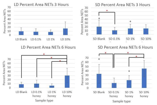 The incorporation of 0.1% honey significantly reduces NETosis on SD templates. percent area NETs on LD and SD templates at 3 and 6 h are shown. * indicates a significant difference between the indicated samples within that template type and timepoint, while + indicates a significant difference from the respective LD template at that timepoint and honey level. Sample size of 3 images per replicate, 4 replicates per timepoint per experiment, with 3 unique donor experiments. Raw data is available in Supplementary Spreadsheet 4. Matlab code is available in Supplementary Document 1.