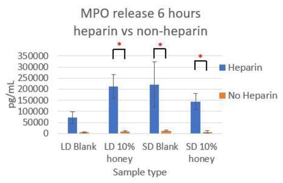 Representative fluorescence images of NETosis on SD and LD templates at 3 and 6 h are displayed in Figure 4 (all images taken from NETosis experiment 3). Red (SO) marks the extracellular DNA indicative of NETosis, while blue (DAPI) indicates the intact nuclei of non-NETosing neutrophils and green indicates NE (colocalized with red-stained DNA in NETs, appearing as yellow as the NET is released). These images demonstrate the higher degree of NETosis found on the SD blank templates relative to the corresponding LD blank templates at both 3 and 6 h, as expected. These images also show the decrease in NETosis on the SD 0.1% honey templates relative to the SD blank templates at 3 and 6 h, and the increase in NETosis on the 10% honey templates in both the LD and SD samples. Figure 5 contains the quantified percent area NETs for each template type at 3 and 6 h compiled from three experiments with neutrophils from three unique donors. As expected, the SD blank samples had significantly more percent area NETs than the LD blank templates at both 3 and 6 h. The SD 0.1% honey templates also had significantly less percent area NETs than the SD blank templates at both timepoints. Meanwhile, 10% honey significantly increased percent area NETs in both the LD and SD templates at 6 h, and had a non-significant increasing trend in the LD templates at 3 h. Together, these results demonstrate that 0.1% honey incorporation is effective at reducing neutrophil NETosis on the surface of SD templates, but that the incorporation of 10% honey induces significant NETosis on the surface of both template types. Figure 6 contains the percent NETosing and necrosing nuclei for each template type at each timepoint. As demonstrated by the data, there was no significant trend in the percentage of necrotic cells for either of the template types at either timepoint, indicating that the honey is not causing necrosis. There is a significant increase in NETosing cells on the LD 10% honey samples at both timepoints, correlating with the increase in percent area NETs observed in Figure 5. There are no significant differences in NETosing cells in the SD samples at 3 h, but at 6 h, there is a significant decrease in NETosing cells in the SD 0.1% honey samples and SD 10% honey samples. The decrease at 0.1% honey correlates with a decrease in percent area NETs in these samples, while the decrease at 10% honey may be due to the fact that these cells have already progressed in their NETosis response to the extent that their nuclei are no longer identifiable. Figure 7 contains the MPO concentrations in the supernatants taken from LD and SD templates with and without 10% honey cultured in the presence or absence of heparin. This experiment was performed to ensure that the amount of non-NET-associated MPO was low enough that it would not confound the ability of the MPO assay to accurately quantify NETosis. As the amount of MPO measured in the supernatants of the non-heparin-treated samples was negligible relative to the heparin-treated samples, this experiment determined that the vast majority of MPO available was NET-bound heparin. Thus, the ability of the MPO assay to serve as an accurate measurement of the NETosis response was validated.