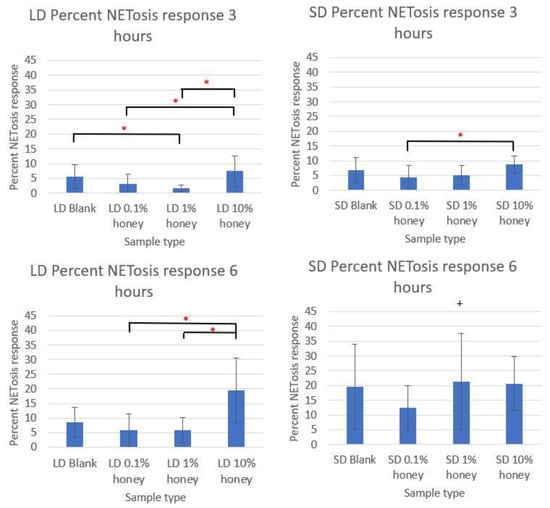 The 0.1% honey and 1% honey samples had the least NETosis response. The percent NETosis response, calculated from MPO concentration normalized to TCP 100 nM PMA positive controls, are shown on LD and SD templates at 3 and 6 h. * indicates a significant difference between the indicated samples within that template type and timepoint, while + indicates a significant difference from the respective LD template at that timepoint and honey level. Sample size of 4 replicates per timepoint per experiment, with 3 unique donor experiments. Raw data is available in Supplementary Spreadsheet 5.