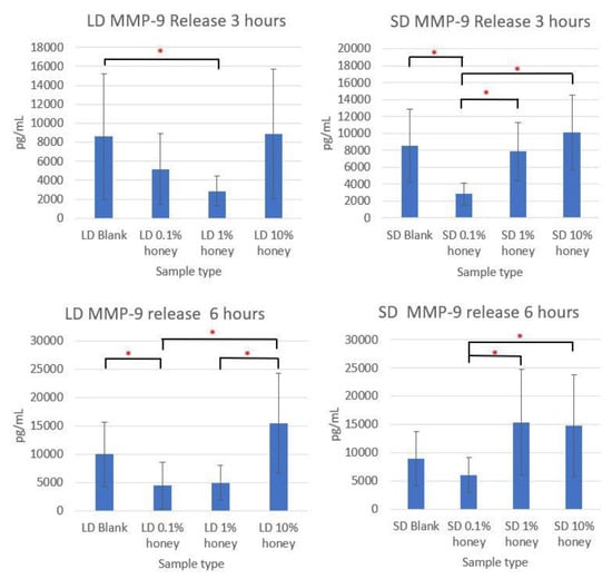 The 0.1% honey and 1% honey samples had the lowest MMP-9 release. The release of MMP-9 is shown on LD and SD templates at 3 and 6 h. * indicates a significant difference between the indicated samples within that template type and timepoint. Sample size of 4 replicates per timepoint per experiment, with 3 unique donor experiments. Raw data is available in Supplementary Spreadsheet 5.