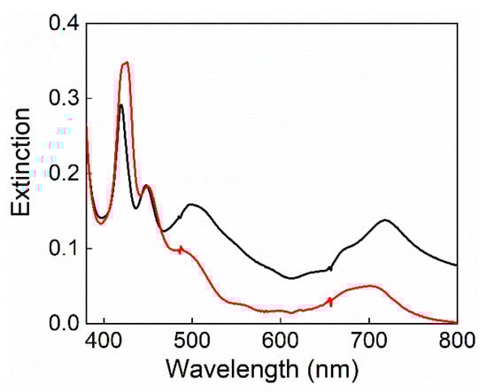 Extinction spectra of 0.77 wt % TPPS/ sulfonated poly(etheretherketone) (s-PEEK) dispersion in dimethyl acetamide (DMAc). Instantaneously after filler addition (black line) and in sol phase after 90 min at 80 °C (red line).