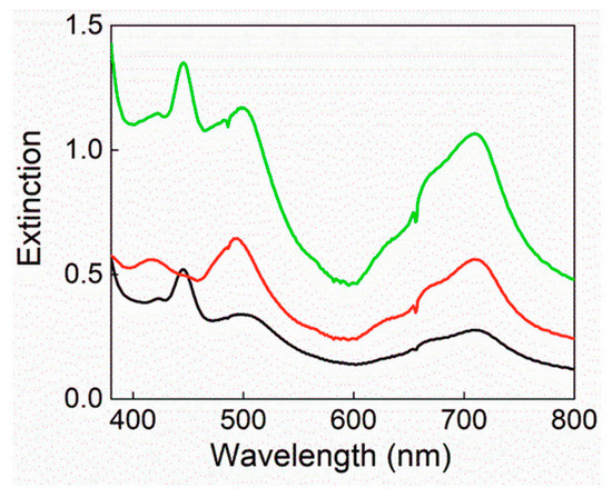 Extinction spectra of s-PEEK/TPPS composite membranes re-cast from DMAc 0.35 wt % TPPS (black line), s-PEEK-0.77 (red line) and s-PEEK-1.5 (green line) at 25 °C.